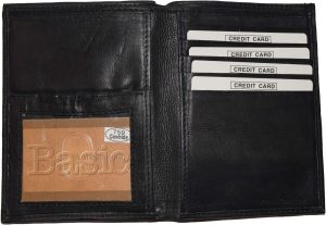 leather checkbook wallet with 4 bill spaces. 2 divided coin pockets and a built-in